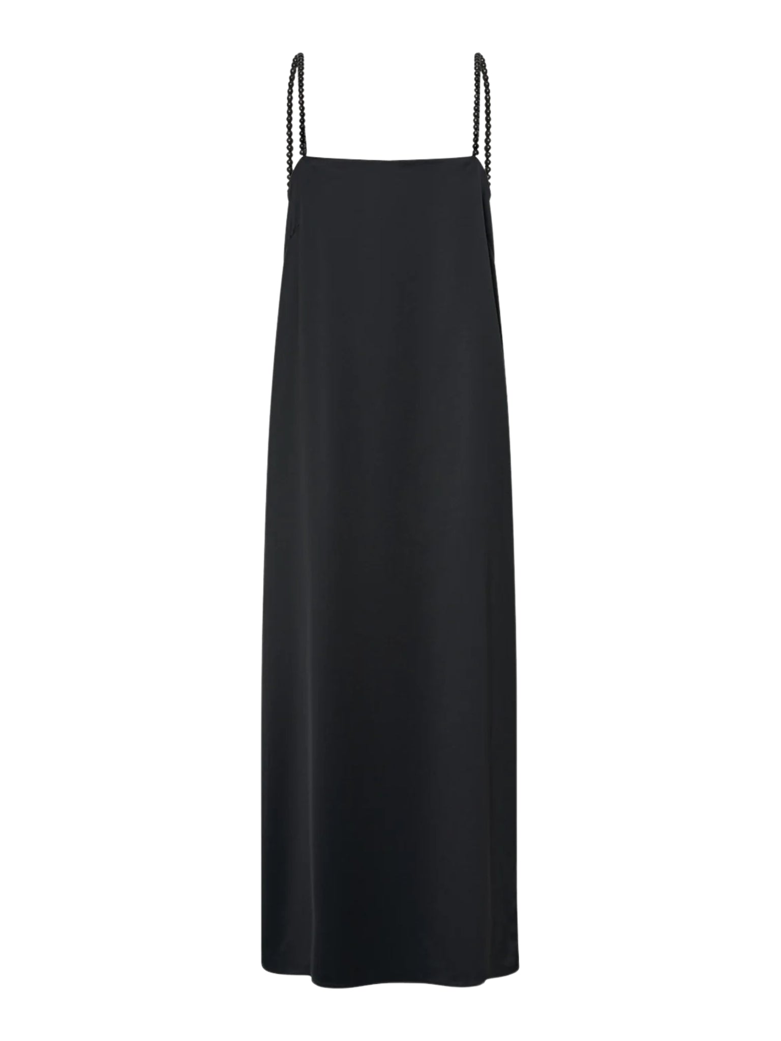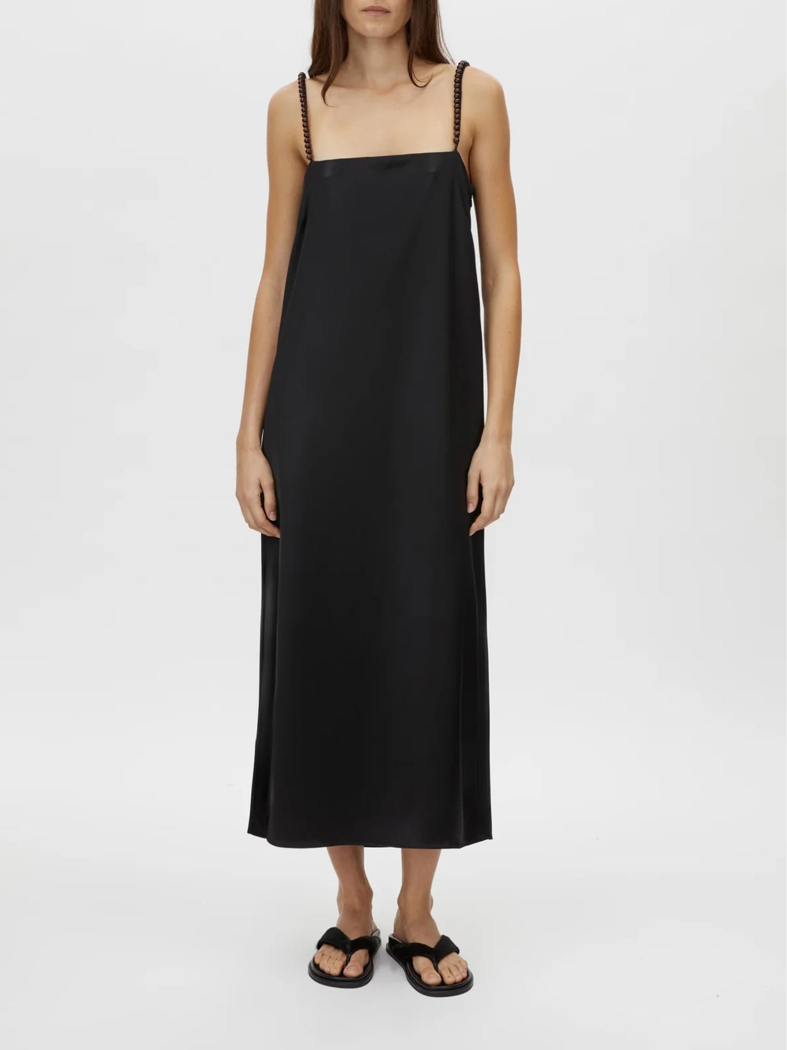 CAMILLA AND MARC Arion beaded black satin slip dress that finishes just above the ankle. Straight neckline. Side seam opening with hook and eye closure.