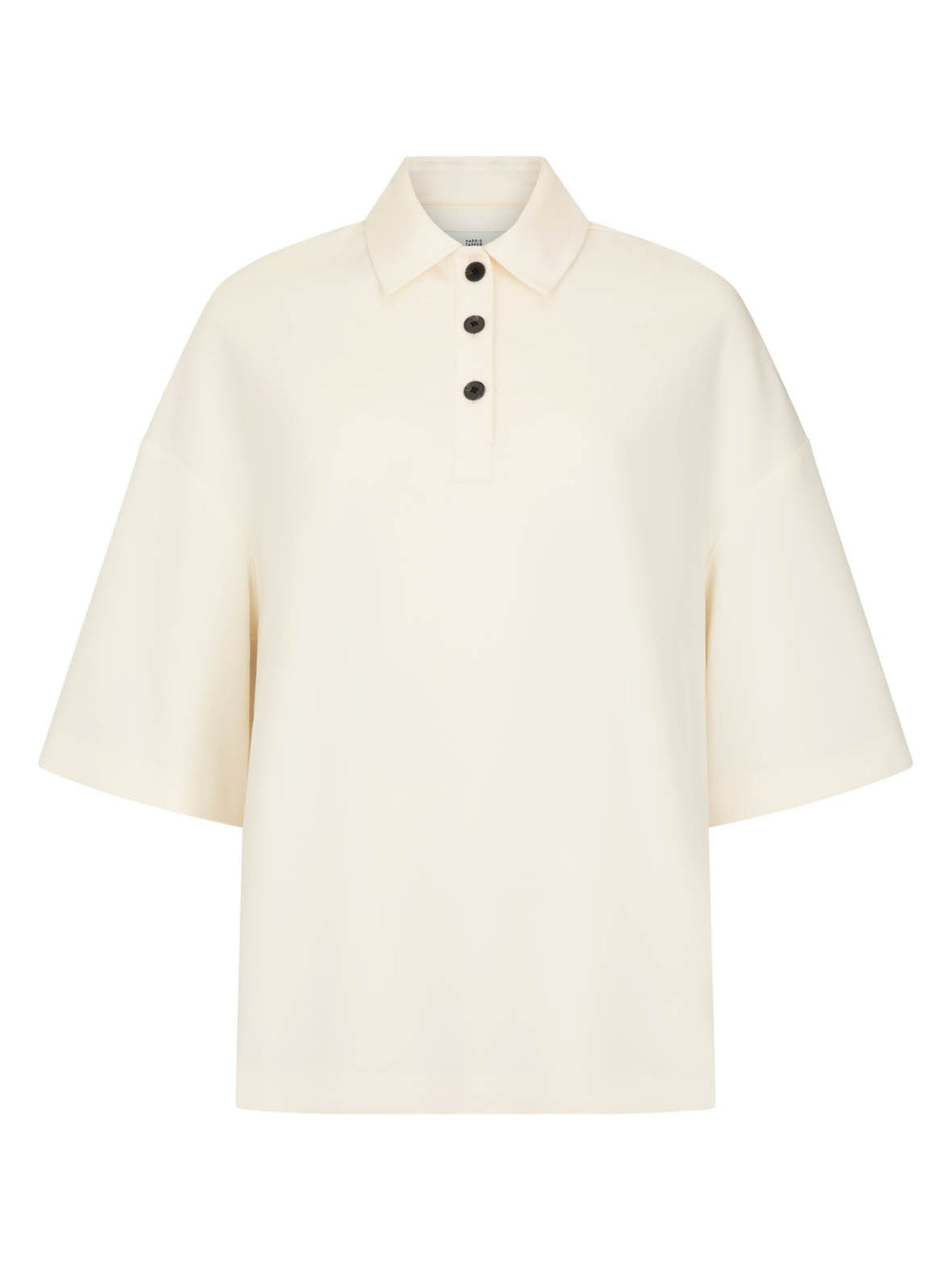 A short sleeve polo with a relaxed silhouette. Features a pointed collar, three-button placket, and dropped shoulders.