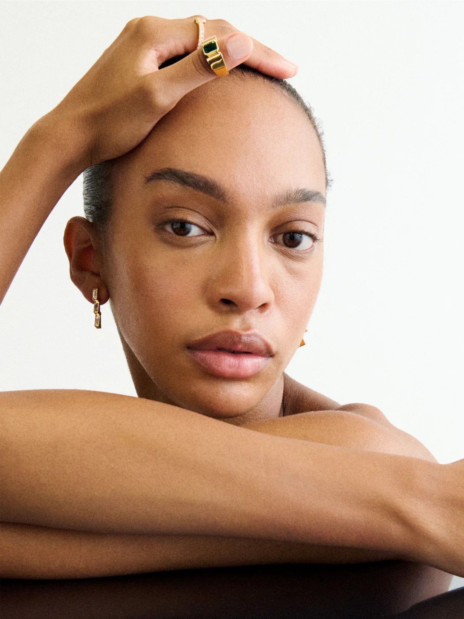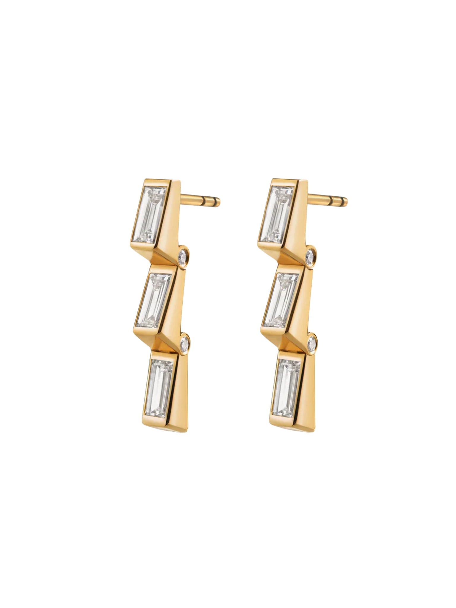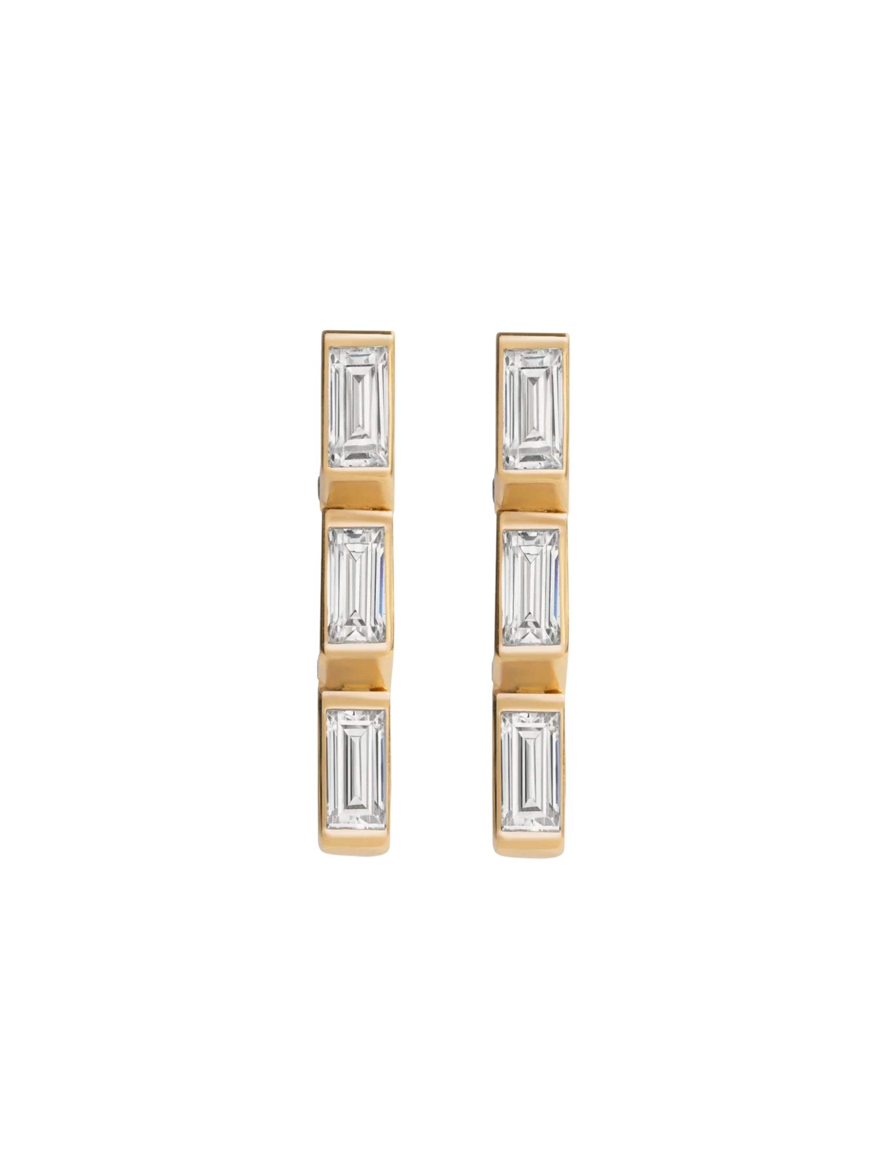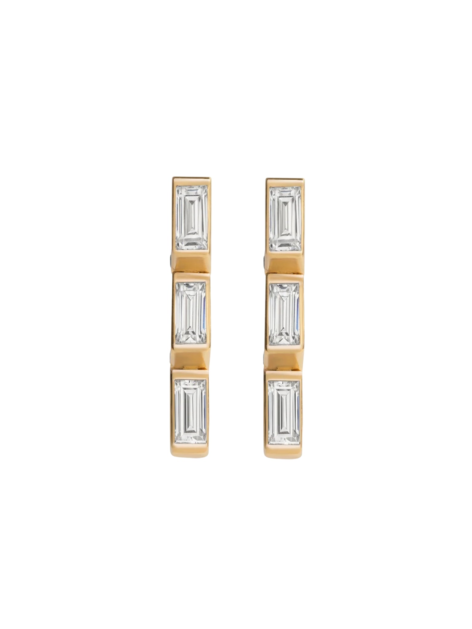 Handcrafted in New York from certified 18K recycled yellow gold, the Hinged Three Drop Earring showcases EREDE’s signature diamond-studded hinge, creating a modernist silhouette that enables unique movement and reflection. Adorned with a total of 1.29 carats of cultured VVS diamonds per earring, including 3 baguette-cut diamonds at 0.41 carats each.