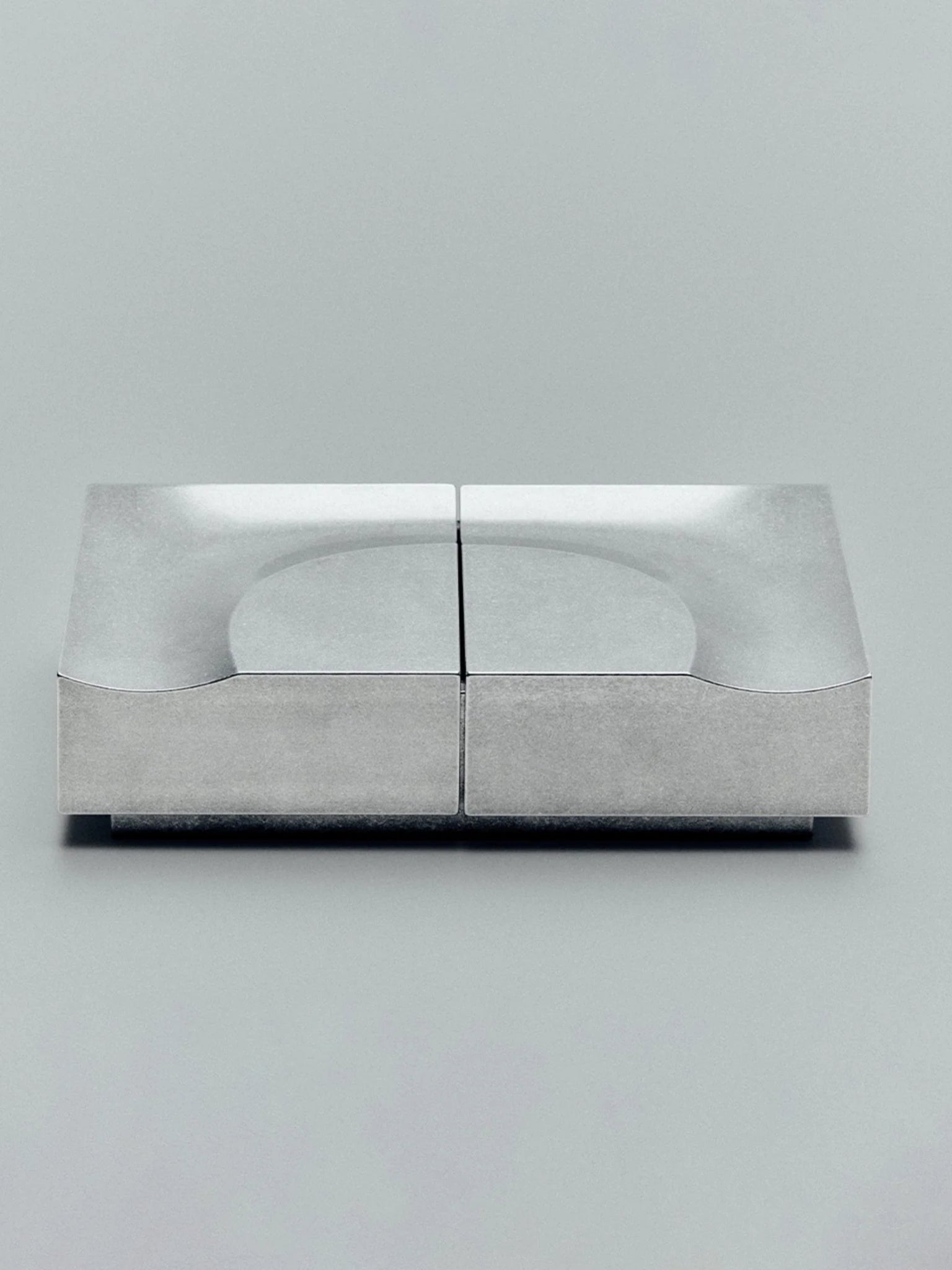 An object of balance, where precise geometry defines the silhouette and yet the surface undulates with a subtle, organic movement. Hewn from solid aluminium and softened through a fine rumble polish, Valence carries the presence of a crafted metal form that will evolve with time, its surface deepening in character and tone. The twin lids open in a gentle, clamshell motion to reveal a lining of soft suede — a resting place for treasured pieces. Like all precious metals, its beauty can be renewed with a simple polish, yet its patina tells the story of touch, time, and care.
