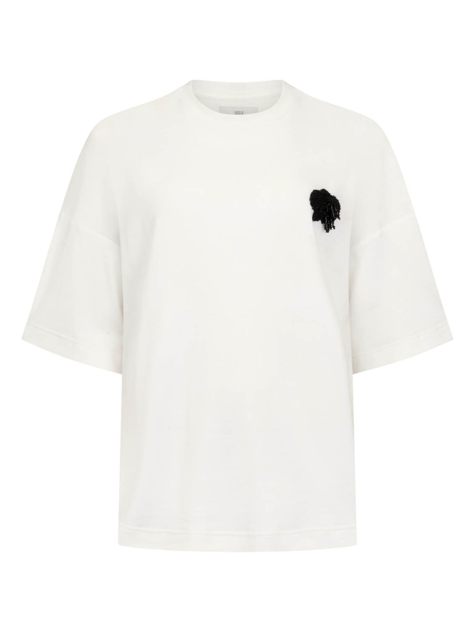 The Beaded Orchid T-Shirt by Harris Tapper is cut from Cotton T-shirting with dropped shoulders and elbow grazing sleeves for an intentionally oversized fit. Signature black orchid beading embellishes high on the left chest.