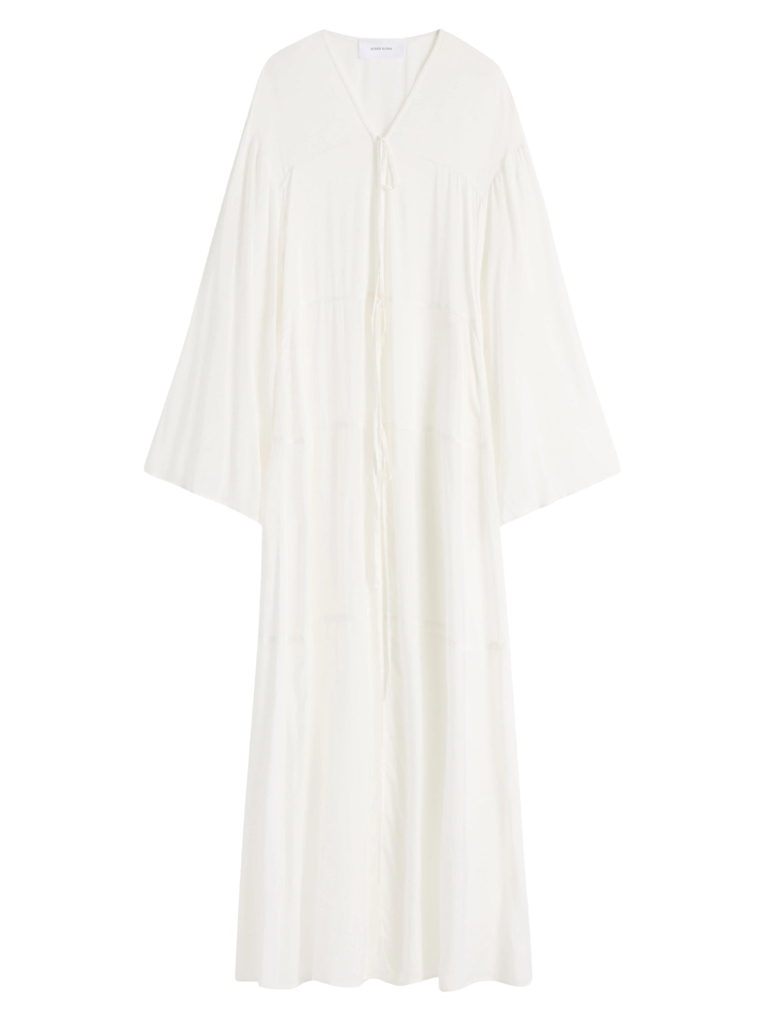 The Cremona Tie-Front Maxi Coverup in White is a flowing, lightweight layer crafted from soft European rayon voile. Defined by its gently flared silhouette, panelled seams and relaxed long sleeves, this maxi-length design fastens with an elegant tie-front closure. Cut for a relaxed fit with flexible sizing, it slips easily over swimwear for effortless resort styling.