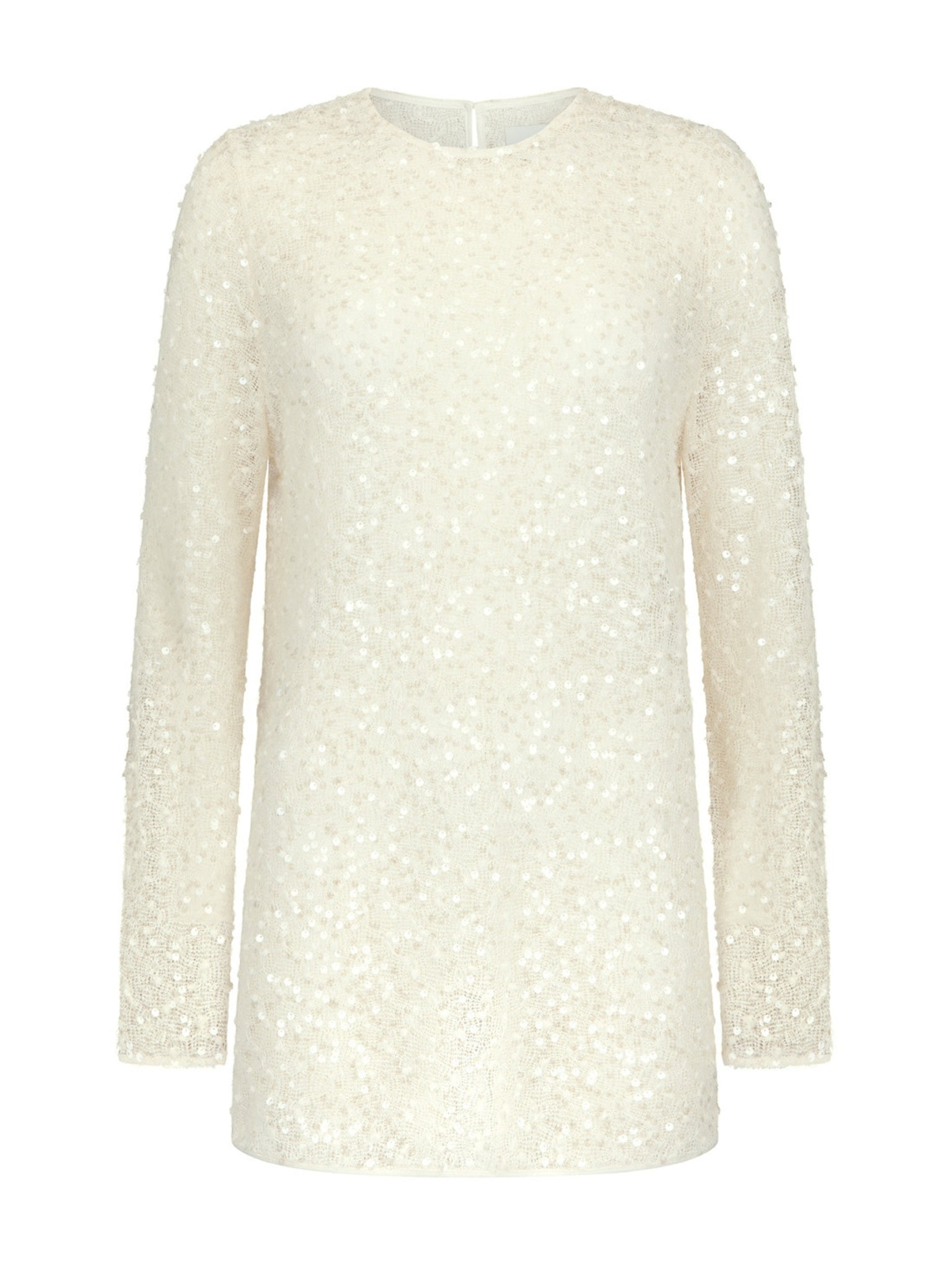 The Eva Top by Harris Tapper is a relaxed silhouette crafted in a sheer sequin knit. Featuring long sleeves and a three button closure at the centre back, this piece offers subtle shimmer with an effortless drape.