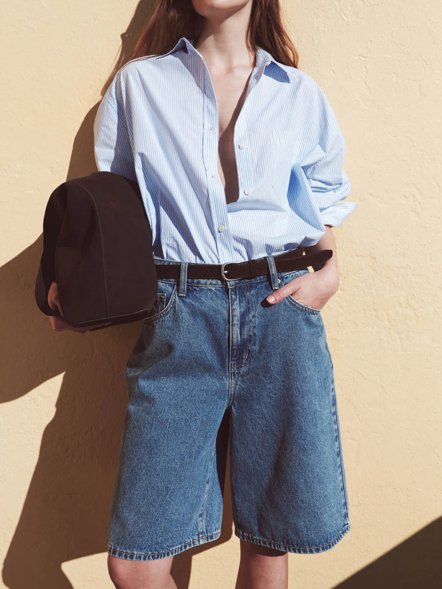 Knee-length Bermuda shorts crafted from a midweight cotton denim. Designed to sit mid-rise, they offer a relaxed fit through the leg.