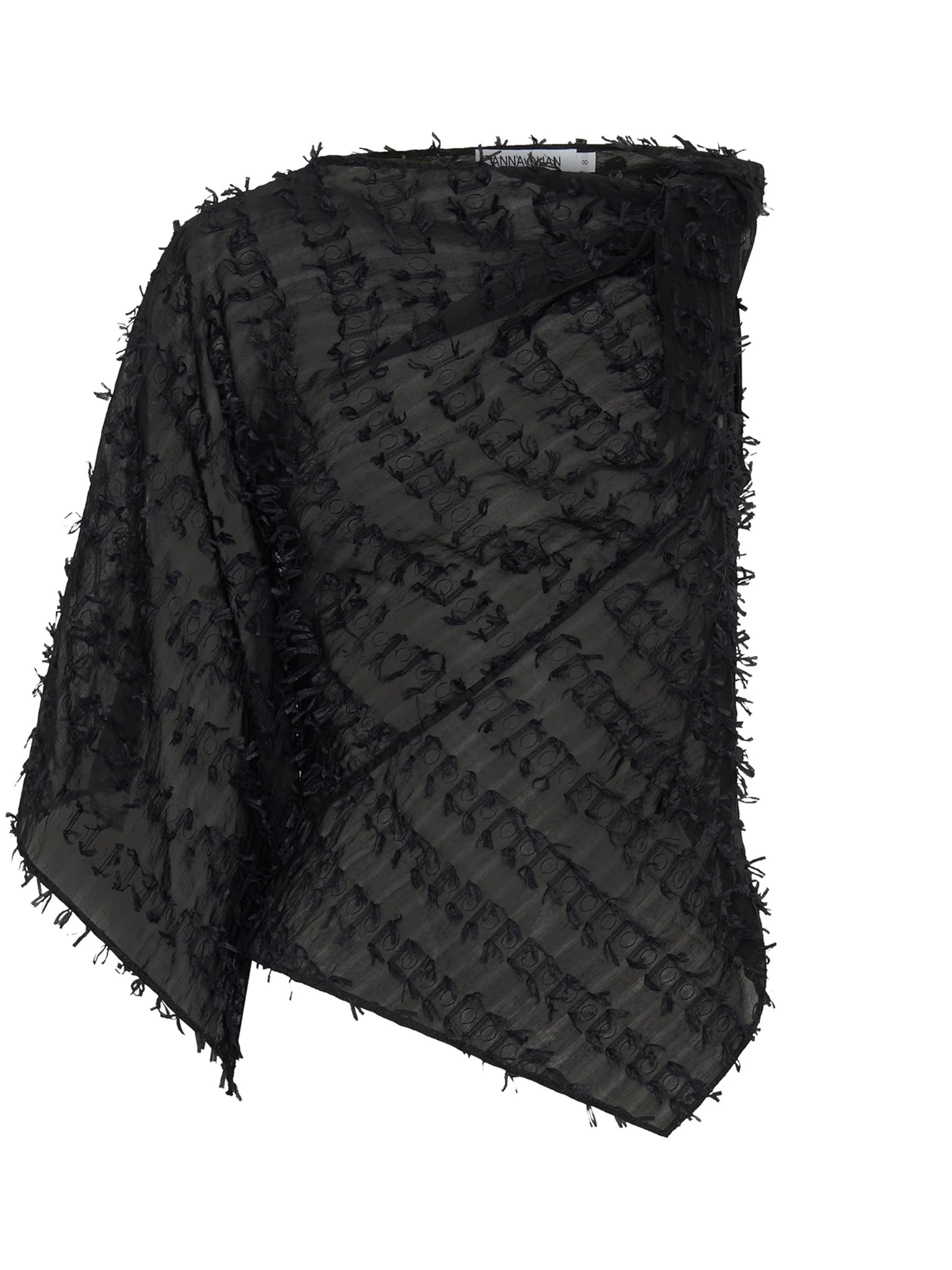 The Marybeth Top by Anna Quan in Clipped Jacquard is an asymmetrical top crafted in a delicate ribbon woven fabrication. Featuring a draped sleeve with a split on the right arm and a twisted strap on the left shoulder.