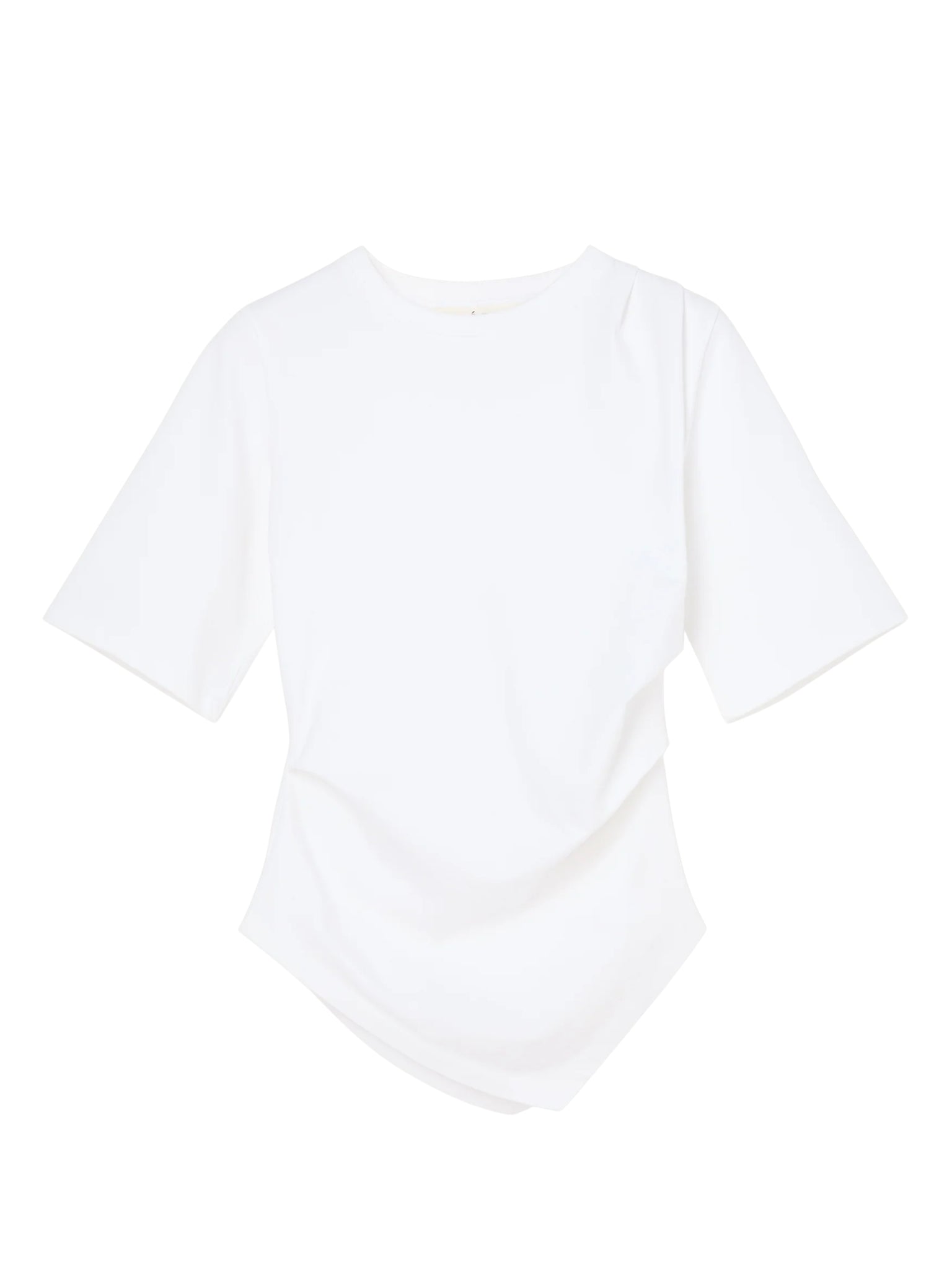A sculptural update to the everyday T-shirt. Designed with a twisted asymmetrical drape that contours the waist and forms elegantly around the shape of the body, combining comfort with directional design.