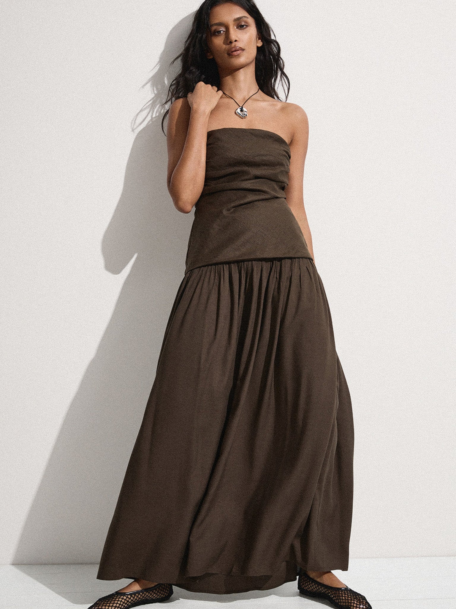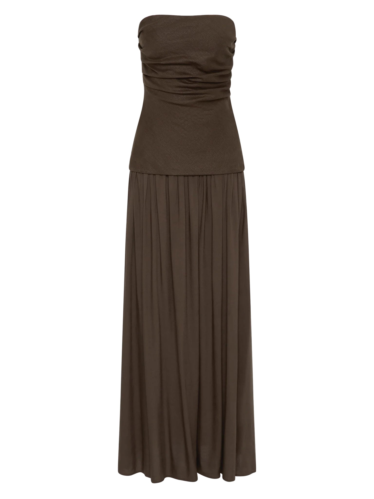 A new yet beloved FAITHFULL silhouette that continues in a new shade. A maxi dress with a fitted bodice designed from a signature 100% European Flax® linen fabrication, with gathered detailing across the front. It features a drop waist with a soft gathered skirt that flares into a slight A-line shape, cropping below the ankles. The skirt is designed from a rayon fabrication, offering a unique contrast to the bodice. In a deep forest green hue, wear with a simple heel for effortless yet elevated occasionwear.