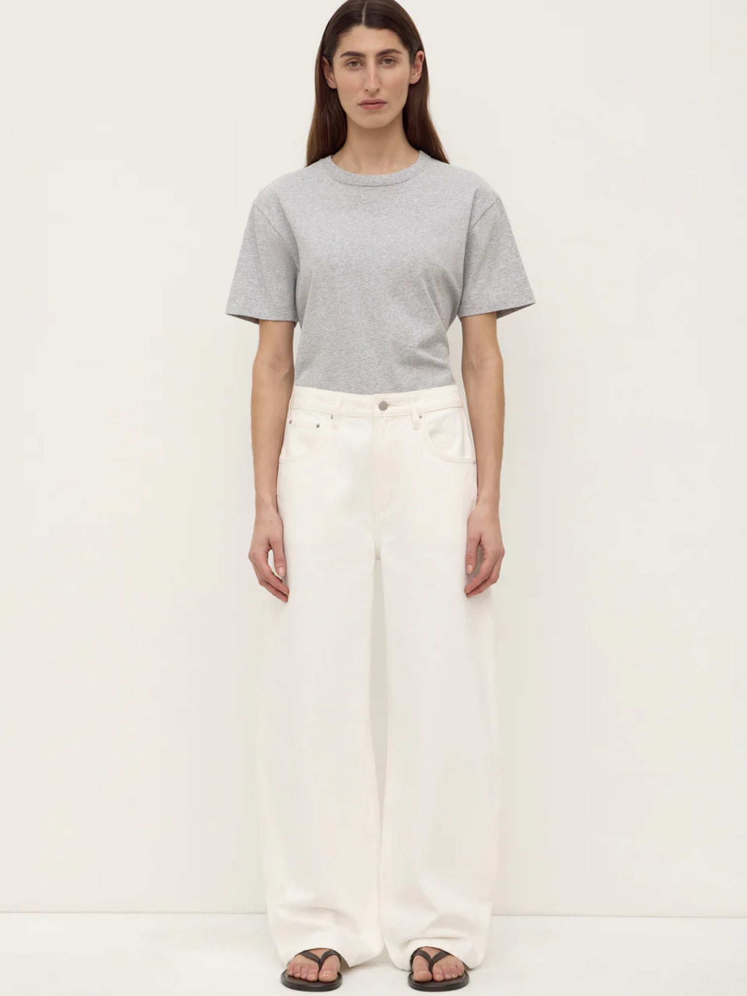 The Low Curve Midrise Jean in vintage white is a mid-rise, relaxed-fit jean with zip fly, five-pocket detail, and a subtle curved out seam tapering at the hem.