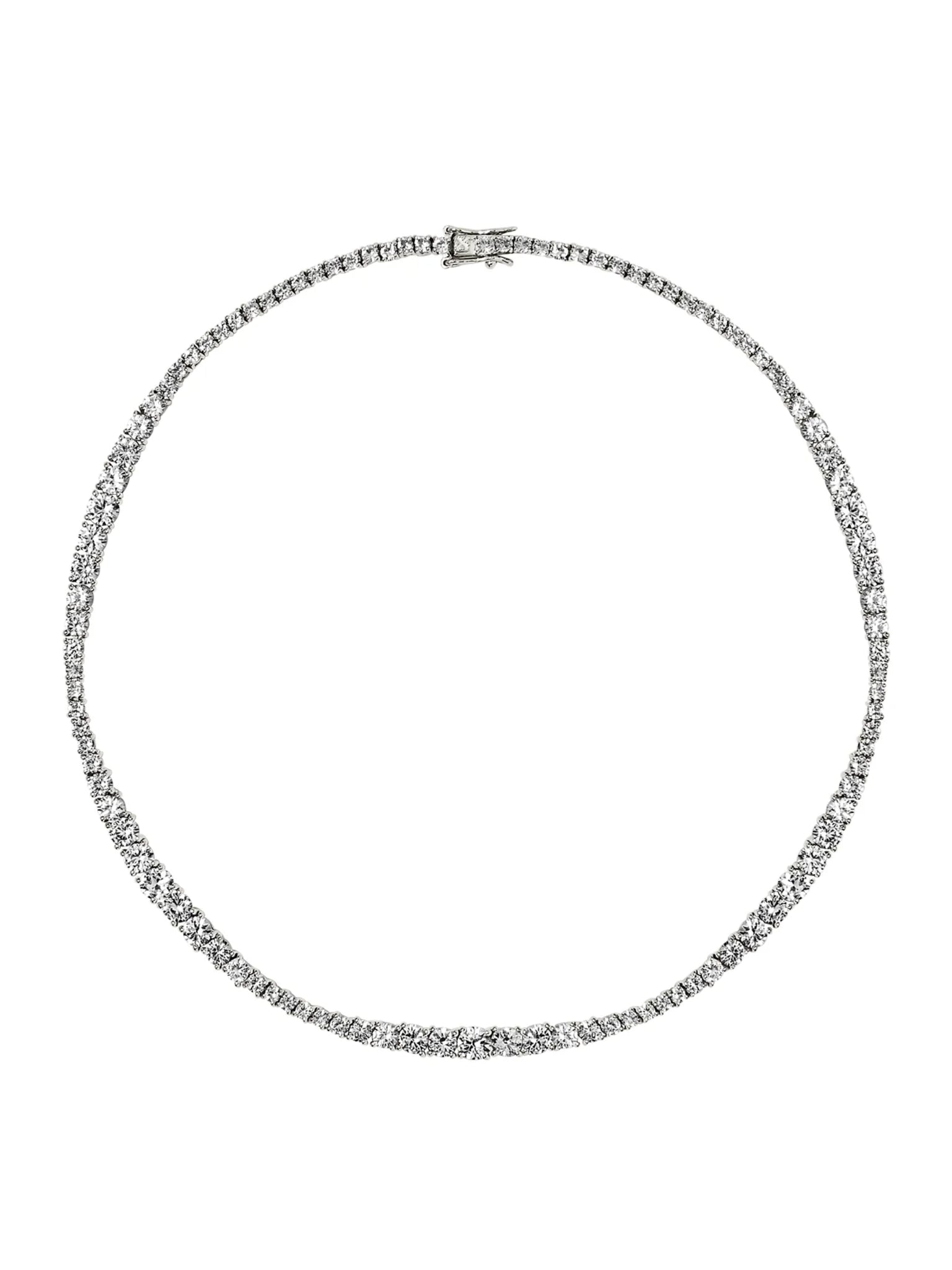 The Isadora Rivière Necklace showcases an elegant graduating silhouette of lab-grown white sapphire gemstones, each securely set in a classic four-prong sterling silver setting. This occasion tennis necklace is finished with a secure box clasp and reinforced with double safety hooks for added security.
